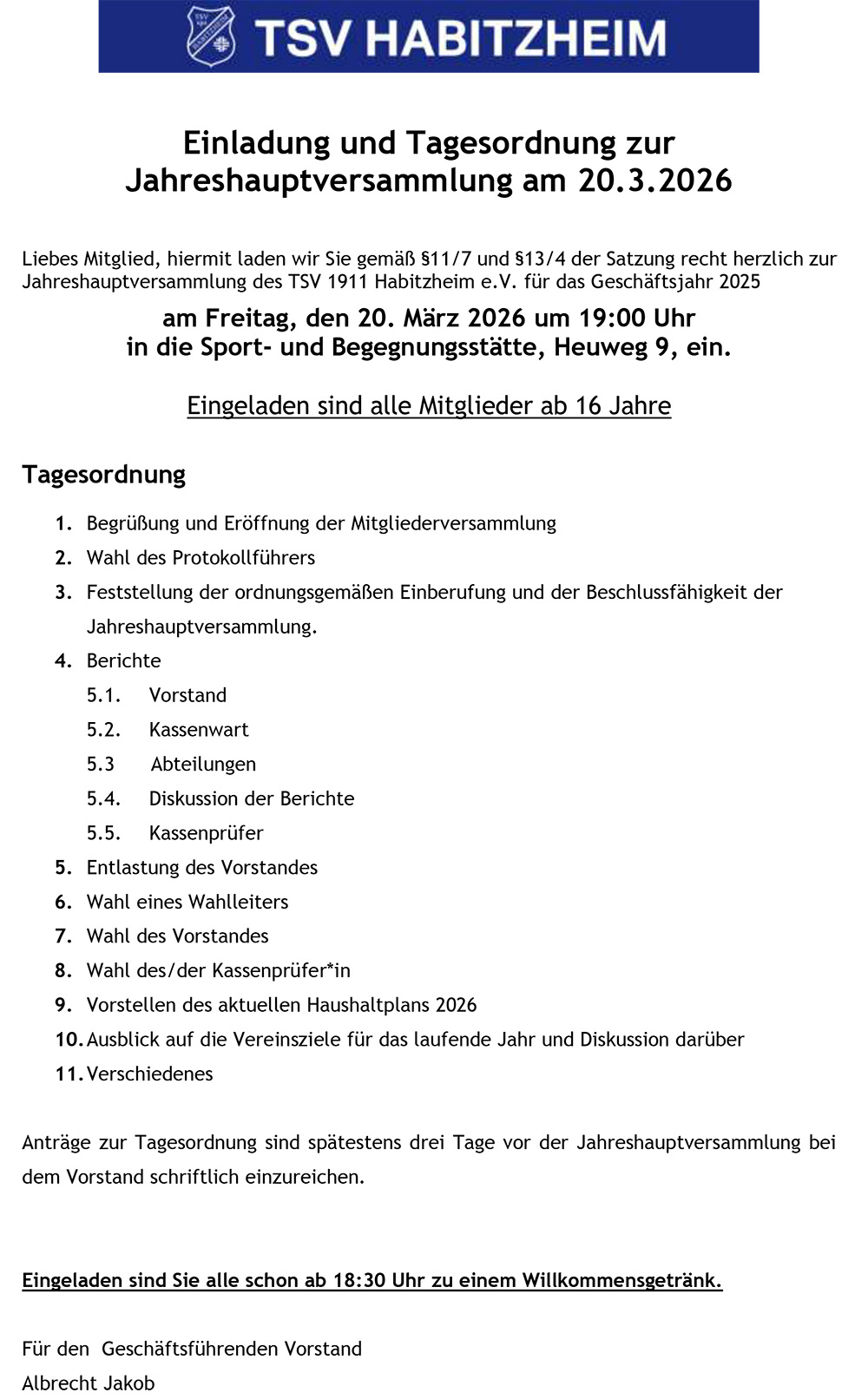 Der TSV Habitzheim wünscht allen Besucherinnen und Besuchern unserer Webseite viel Spaß beim Surfen und freut sich über positives Feedback ebenso wie über konstruktive Kritik, der wir gern nachgehen. Schreiben Sie uns Ihre Meinung ins Gästebuch oder nutzen Sie unser Kontaktformular.